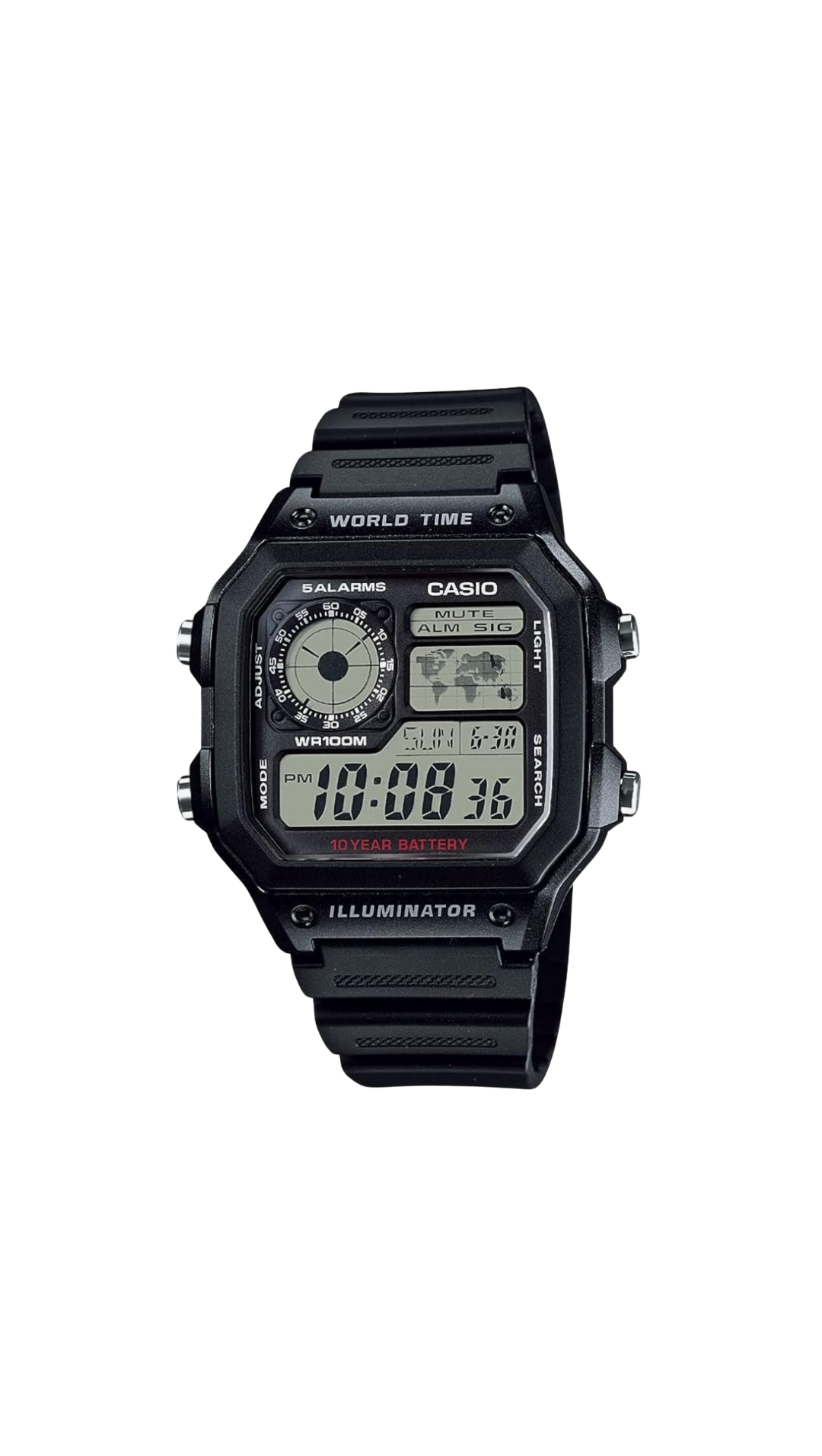 Perfect for frequent travelers or multitaskers, the AE1200WH-1A features World Time with a world map display, access to 48 cities across 31 time zones, and 4-city multi-time memory. With its 1/100-second stopwatch, countdown timer, and 5 daily alarms, it delivers all the practical features you need. An amber LED light with afterglow enhances readability day or night, and the full auto-calendar keeps you on track through the year 2099.