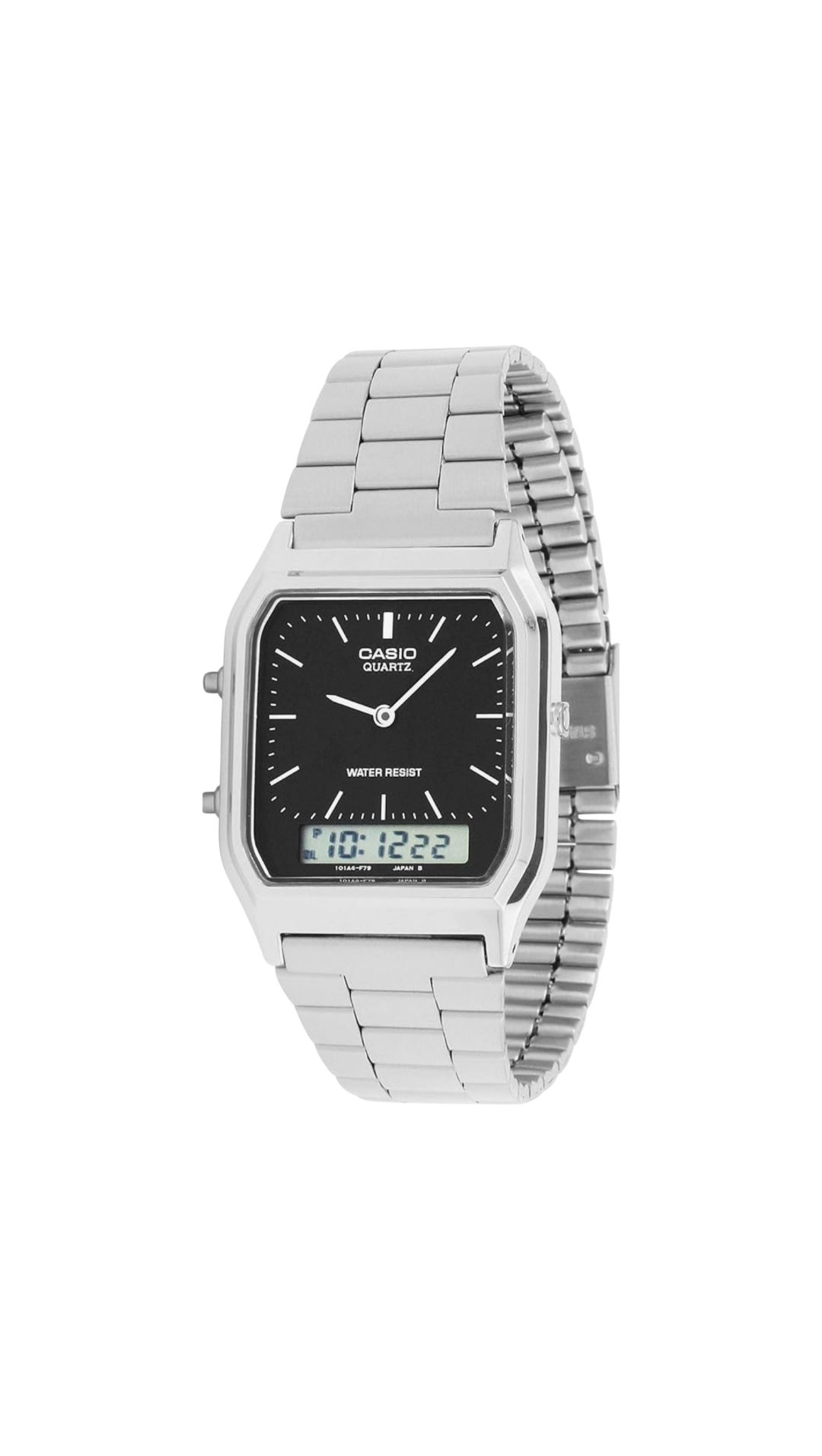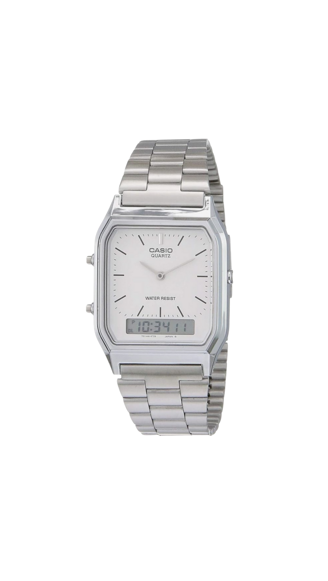 The Casio AQ-230 Series combines retro styling with functional hybrid design, offering both analog and digital time displays in a sleek, compact case. Its slim profile and lightweight build make it comfortable for daily wear, while the vintage aesthetic appeals to both modern minimalists and classic watch enthusiasts.