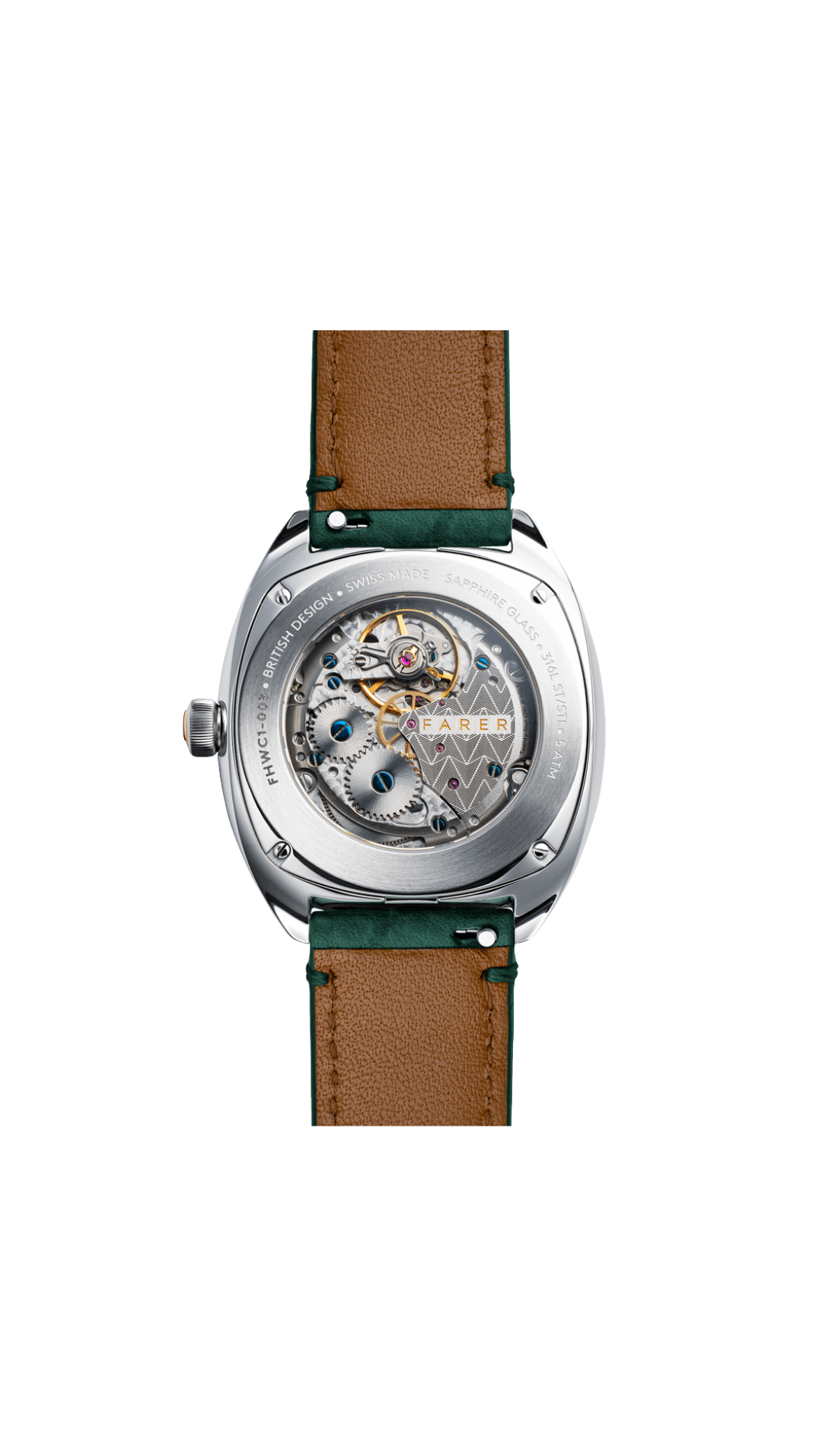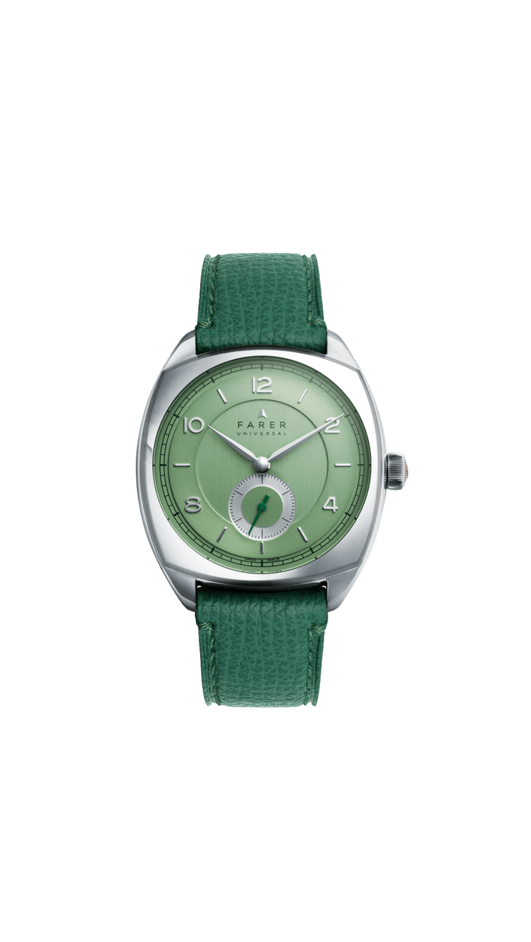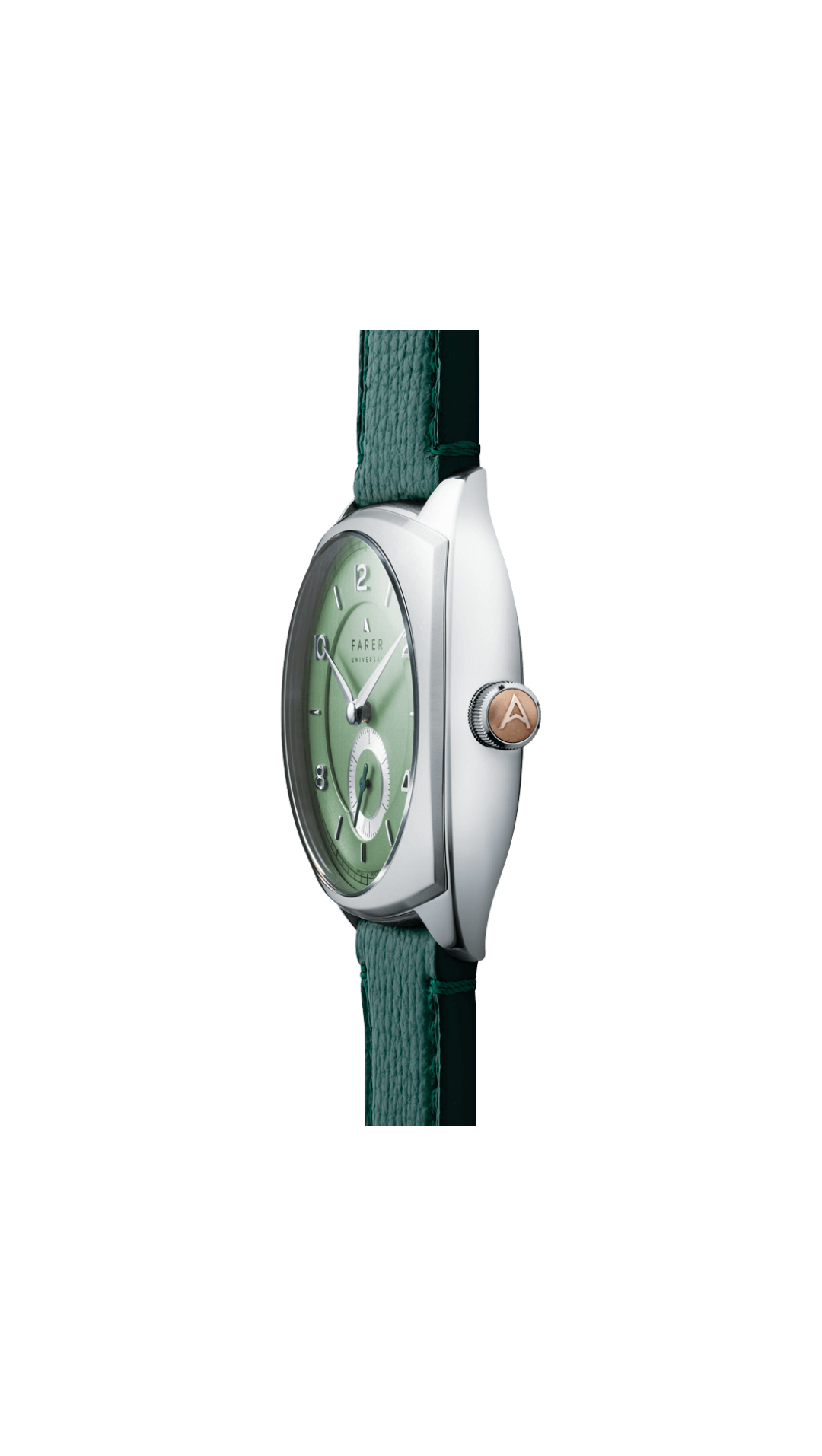 The Mansfield showcases Farer’s distinctive design language with a beautifully proportioned 38.5mm cushion-shaped stainless steel case, paired with a unique tea green sector dial that delivers vintage charm with a modern twist. The dial layout is both elegant and highly legible, featuring a refined small seconds subdial that enhances its classic appeal.