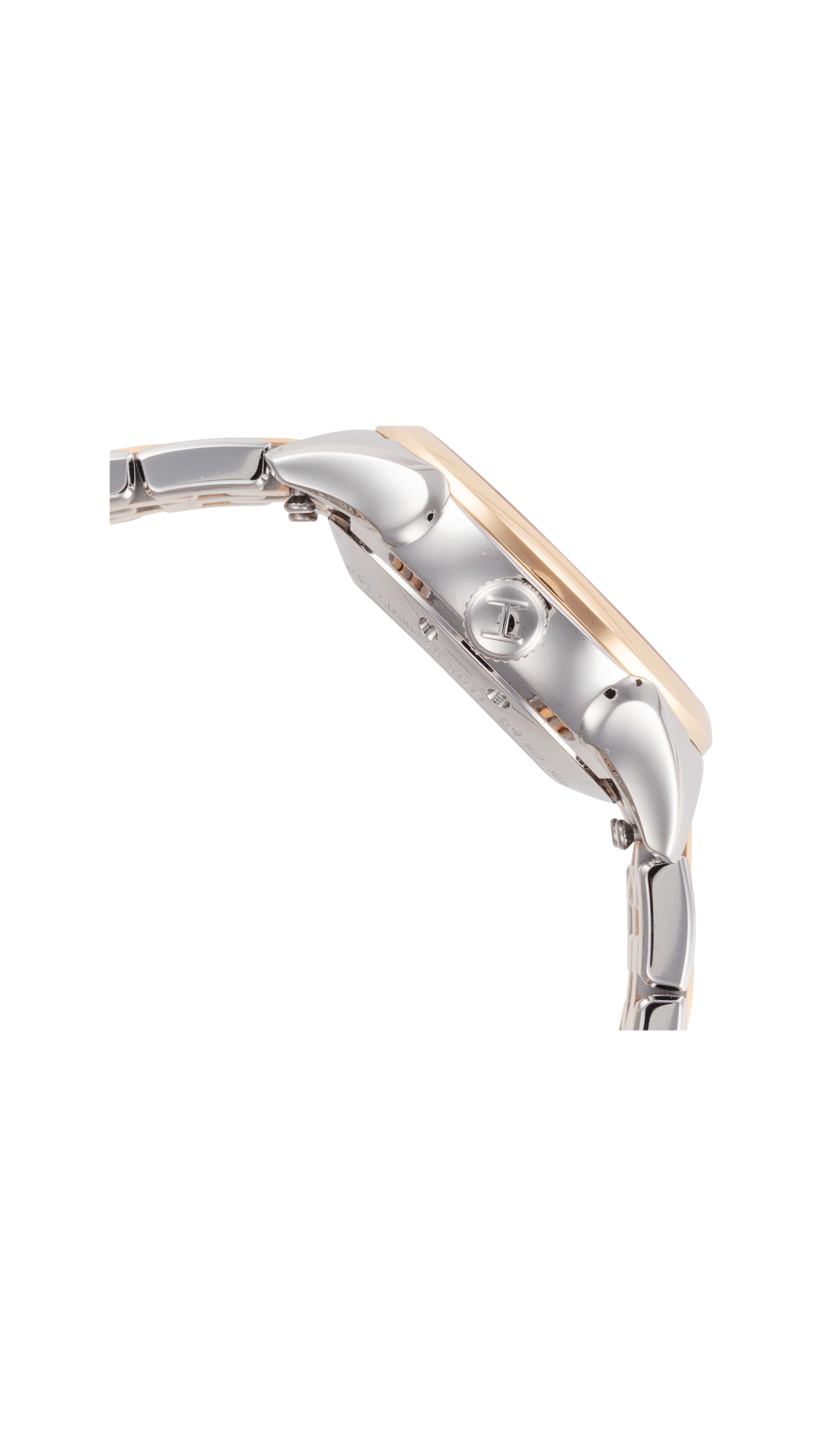 Inside, the watch is powered by a Swiss automatic ETA Calibre 2671 movement, delivering dependable performance with approximately 38 hours of power reserve. The watch is paired with a stylish two-tone stainless steel bracelet in silver and rose gold, secured by a deployment clasp for both comfort and elegance.
