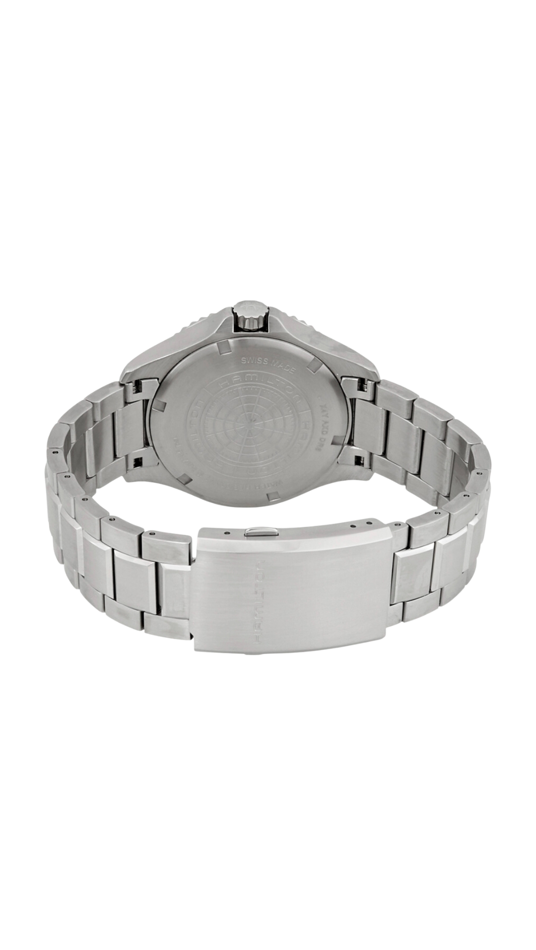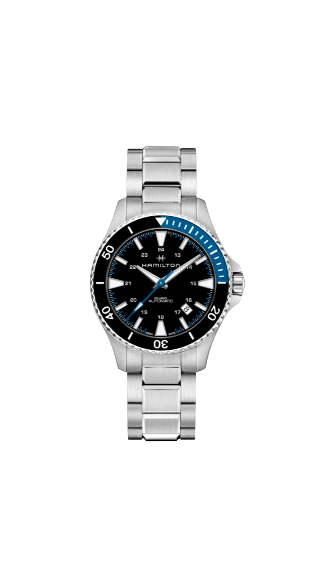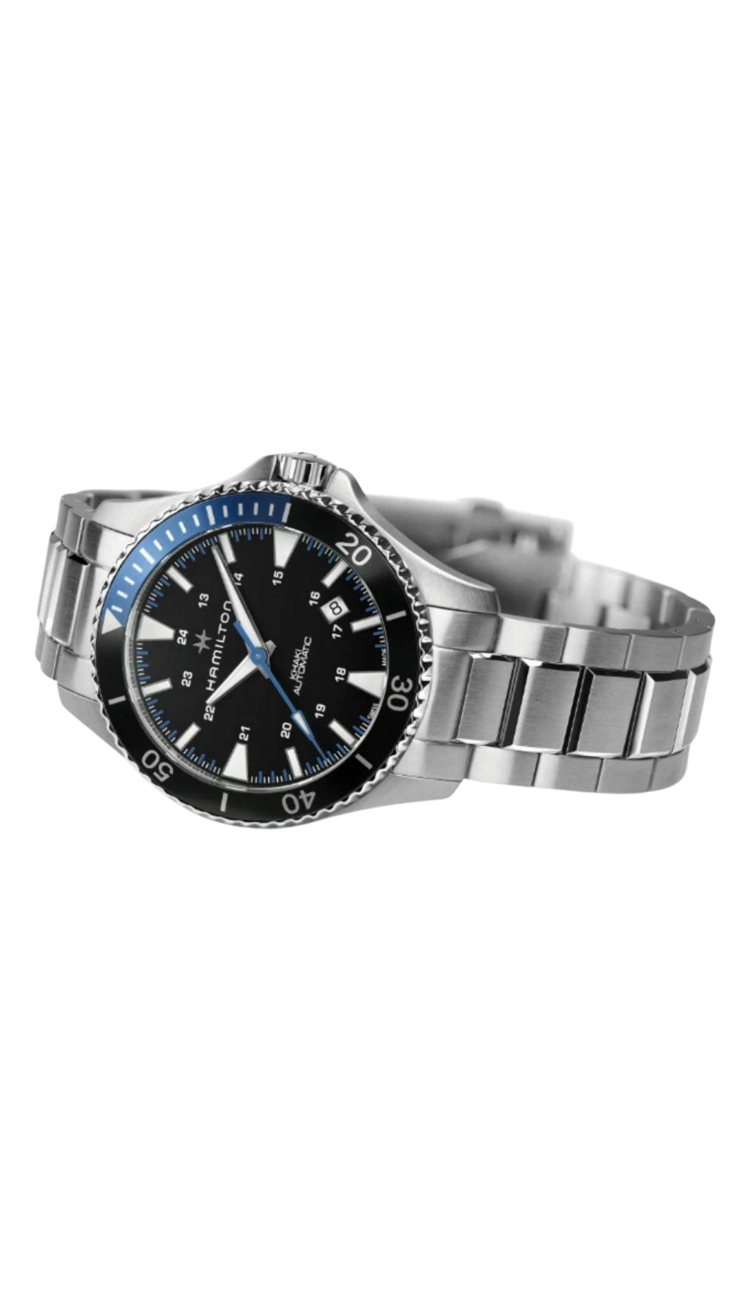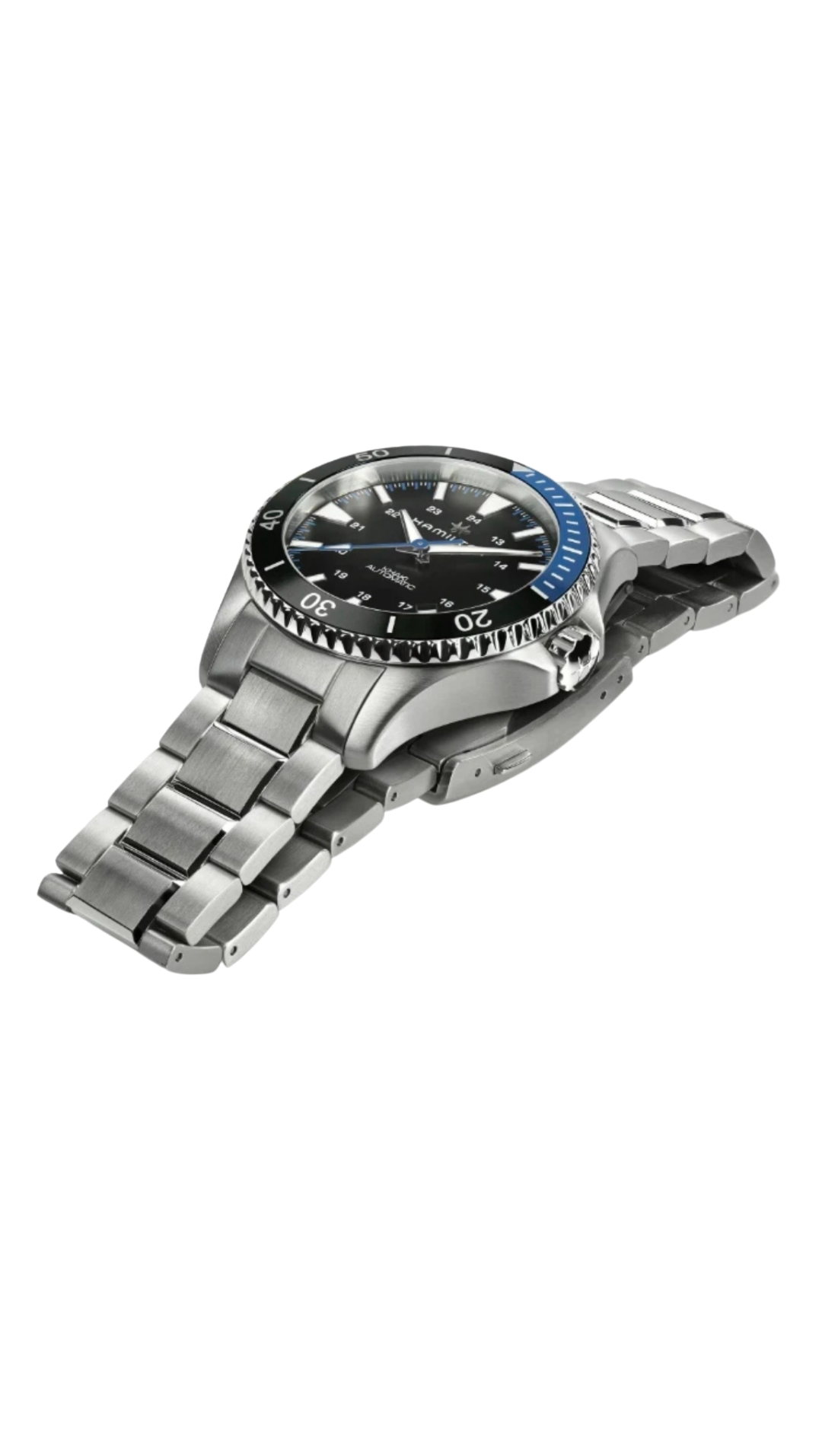 A standout feature of this model is its striking black and blue “Batman” uni-directional rotating bezel, adding a bold and modern touch to its classic diver aesthetic. Built for reliability, it is powered by Hamilton’s H-10 automatic movement, delivering an impressive 80-hour power reserve—perfect for extended wear without constant winding. The screw-down crown and solid construction reinforce its durability, while the sapphire crystal ensures long-lasting clarity and scratch resistance.