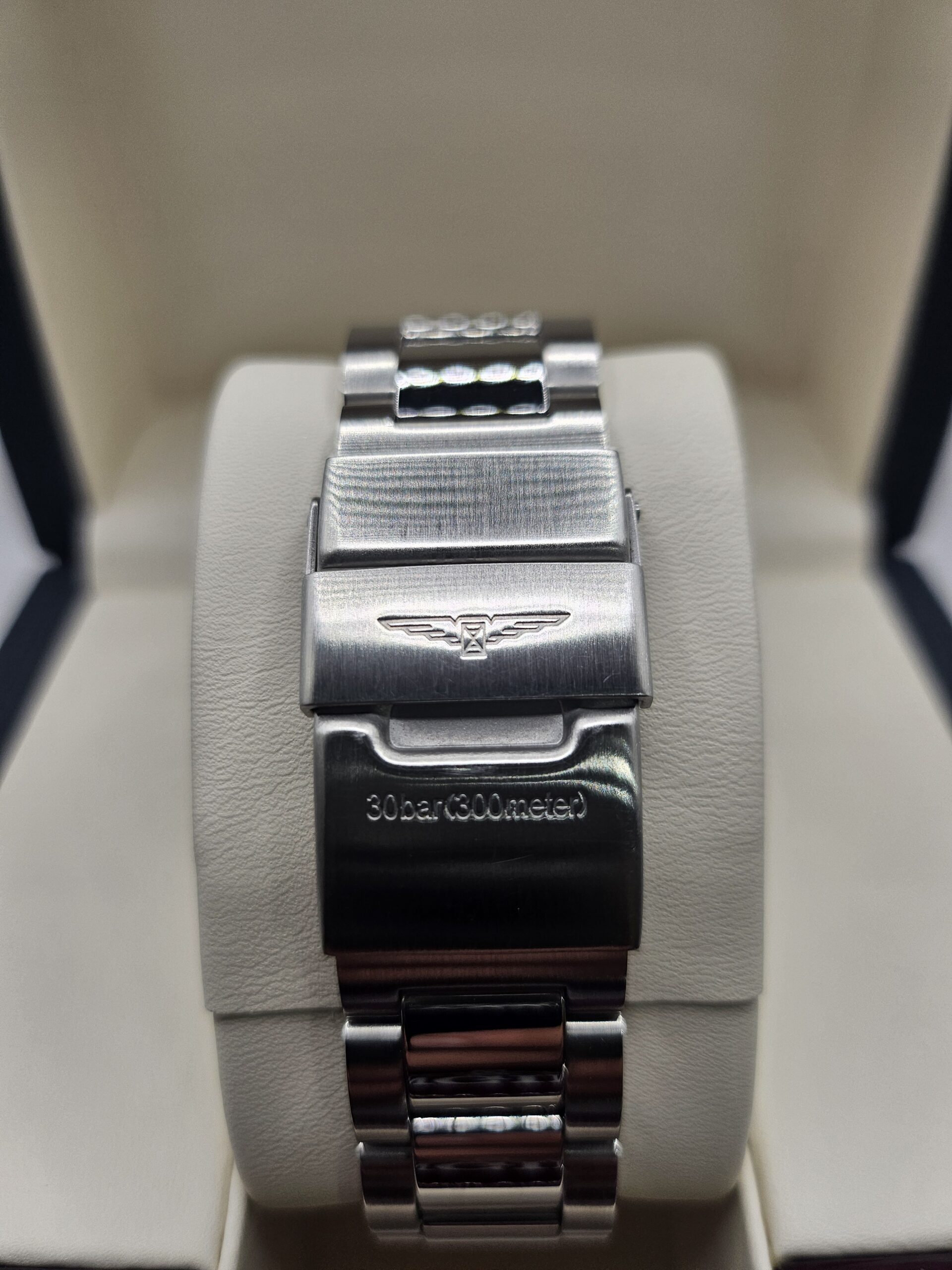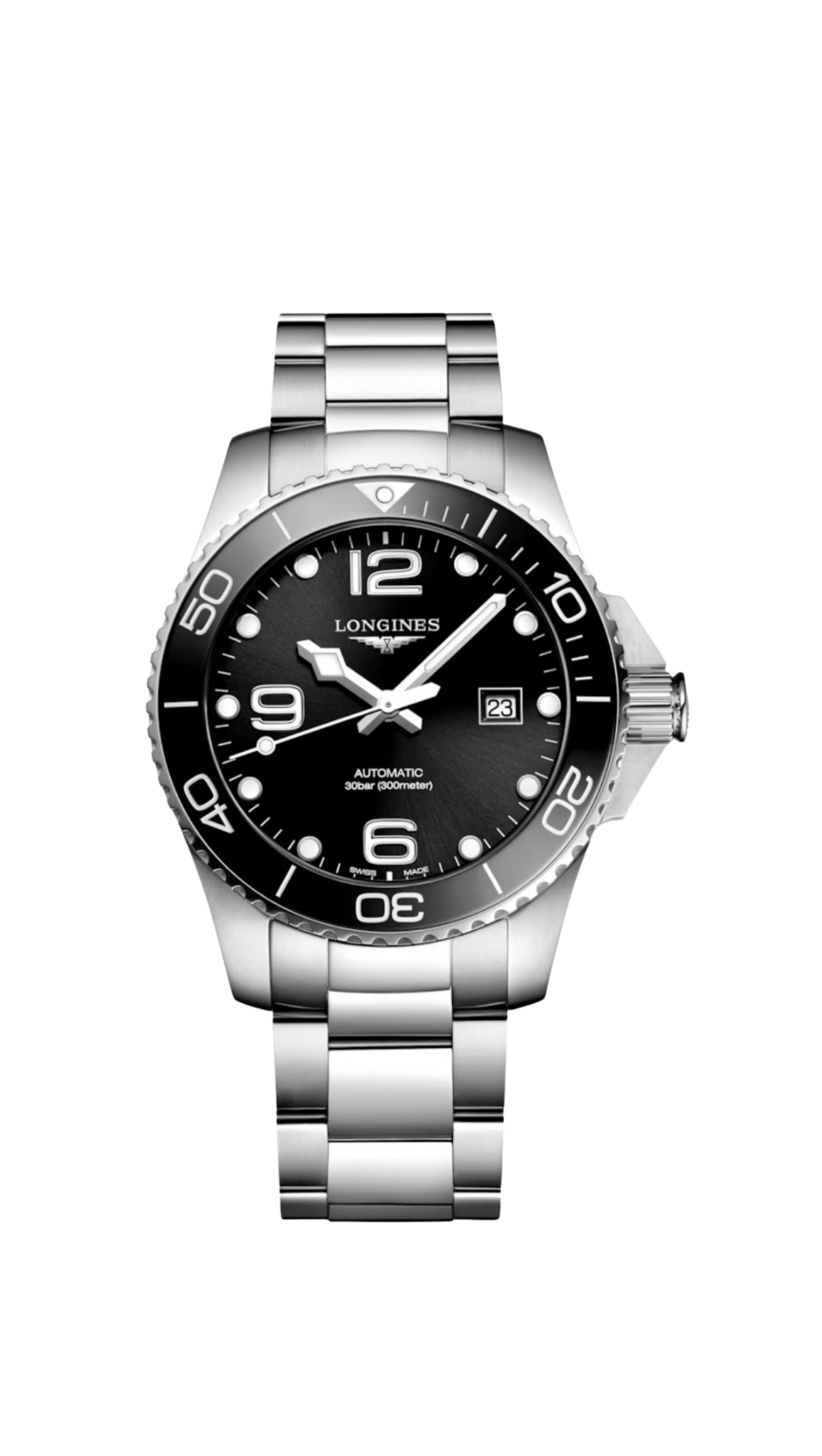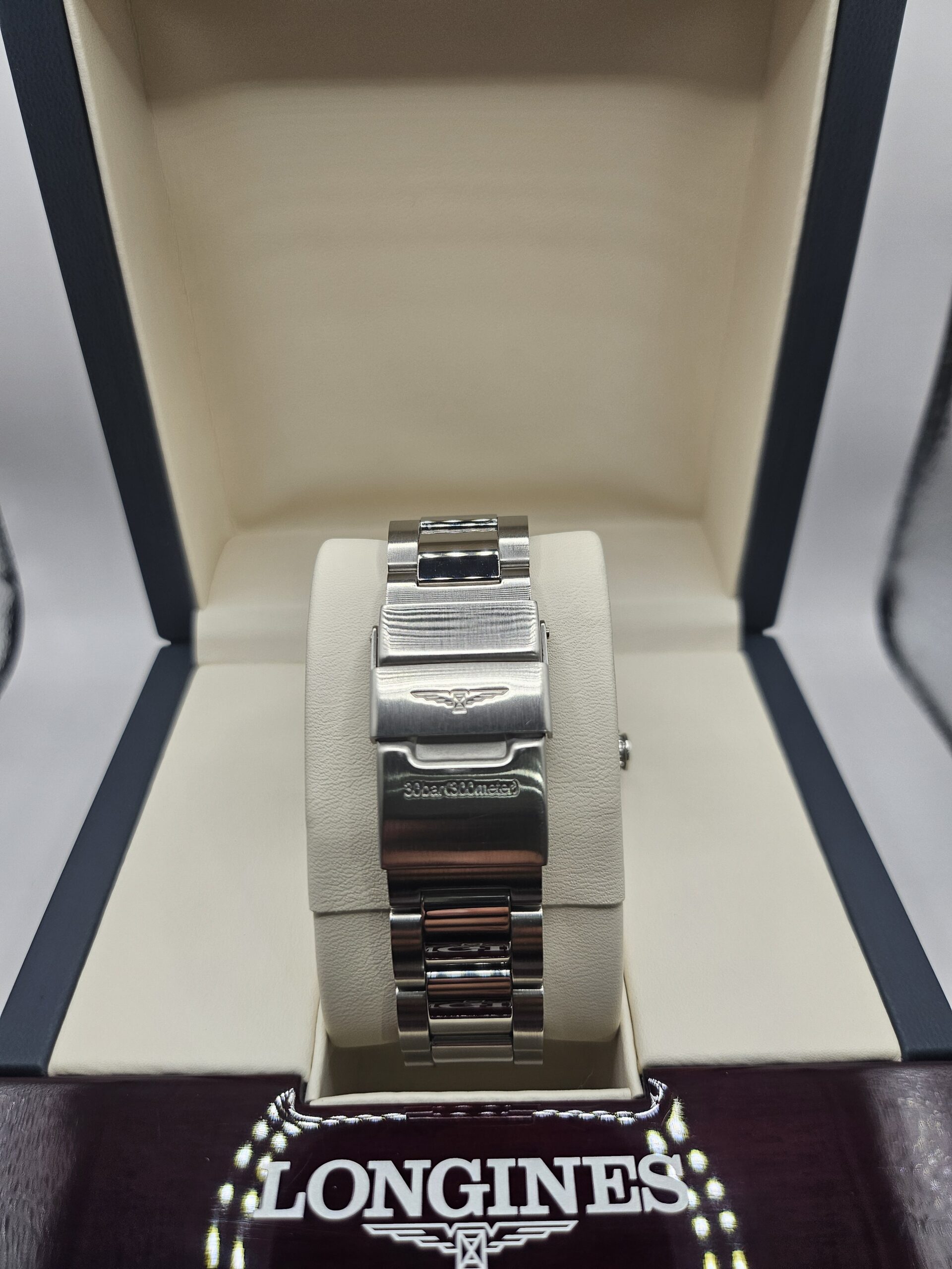 The Longines HydroConquest L37824566 is a bold and refined diver’s watch that balances Swiss precision with a modern, sporty design. Its 43mm stainless steel case is complemented by a durable black ceramic unidirectional bezel, while the scratch-resistant sapphire crystal features multiple layers of anti-reflective coating on both sides for exceptional legibility. The sunray black dial is accented with applied Arabic numerals and indexes, paired with polished silver hands coated in Swiss Super-LumiNova® for optimal visibility underwater. Powering this timepiece is the Longines Caliber L888 automatic movement, beating at 25,200 vibrations per hour and delivering an impressive 72-hour power reserve. Built for performance, it offers 300 metres of water resistance, a screw-down crown, and a secure screw-down caseback. Despite its robust 195g weight, the watch wears comfortably thanks to its 21mm stainless steel bracelet fitted with a double-safety folding clasp. Presented here in mint condition from my personal collection, this pre-owned HydroConquest has been meticulously maintained, making it an ideal choice for collectors and enthusiasts seeking a versatile Swiss dive watch that combines durability, elegance, and reliability.