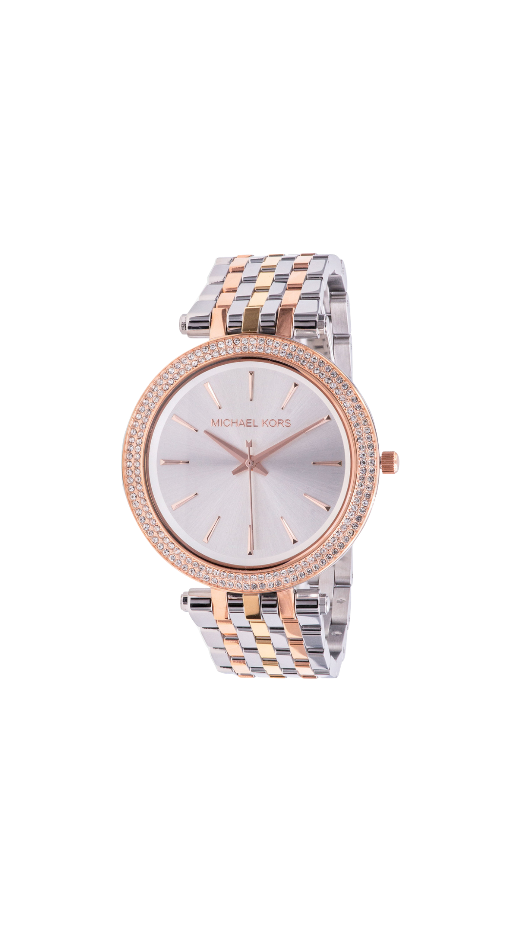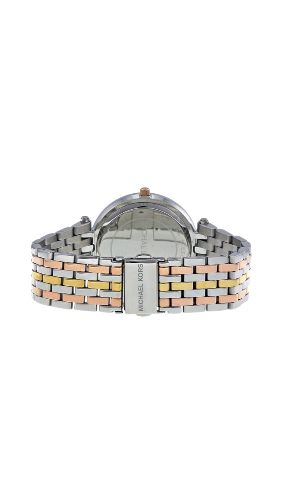 The Michael Kors Darci MK3203 is a sleek and elegant tri-tone timepiece designed for women who appreciate modern glamour with everyday versatility. Its 37 mm stainless-steel case is accented by a crystal-set bezel that adds a touch of refined sparkle without overwhelming the minimalist design. The silver dial maintains a clean and sophisticated aesthetic with simple analog hands, allowing the tri-tone bracelet to stand out as a stylish statement piece. Powered by a reliable quartz movement and protected by a durable mineral crystal, the Darci offers both beauty and dependable performance. Water-resistant to 50 meters, this watch is perfect for daily wear while elevating any look—from casual outfits to evening ensembles.