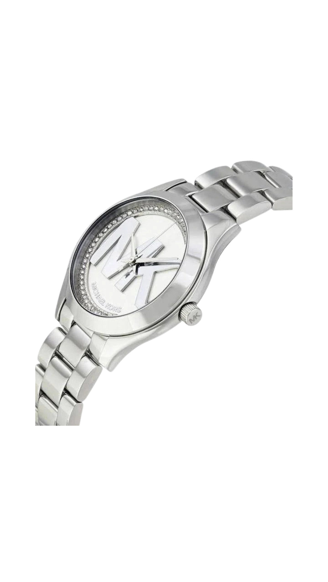 The Michael Kors Mini Slim Runway MK3548 is a chic, sparkling statement piece designed for women who love modern glamour with a minimalist edge. Its 33 mm stainless-steel case and bracelet feature a polished silver-tone finish that pairs effortlessly with any outfit. The silver crystal-set dial catches the light beautifully while maintaining a refined, uncluttered look. Powered by a quartz movement and protected by a scratch-resistant mineral crystal, this timepiece is both stylish and practical. Water-resistant to 50 meters and fitted with a sleek deployment clasp, the MK3548 brings elegant shine to everyday wear.