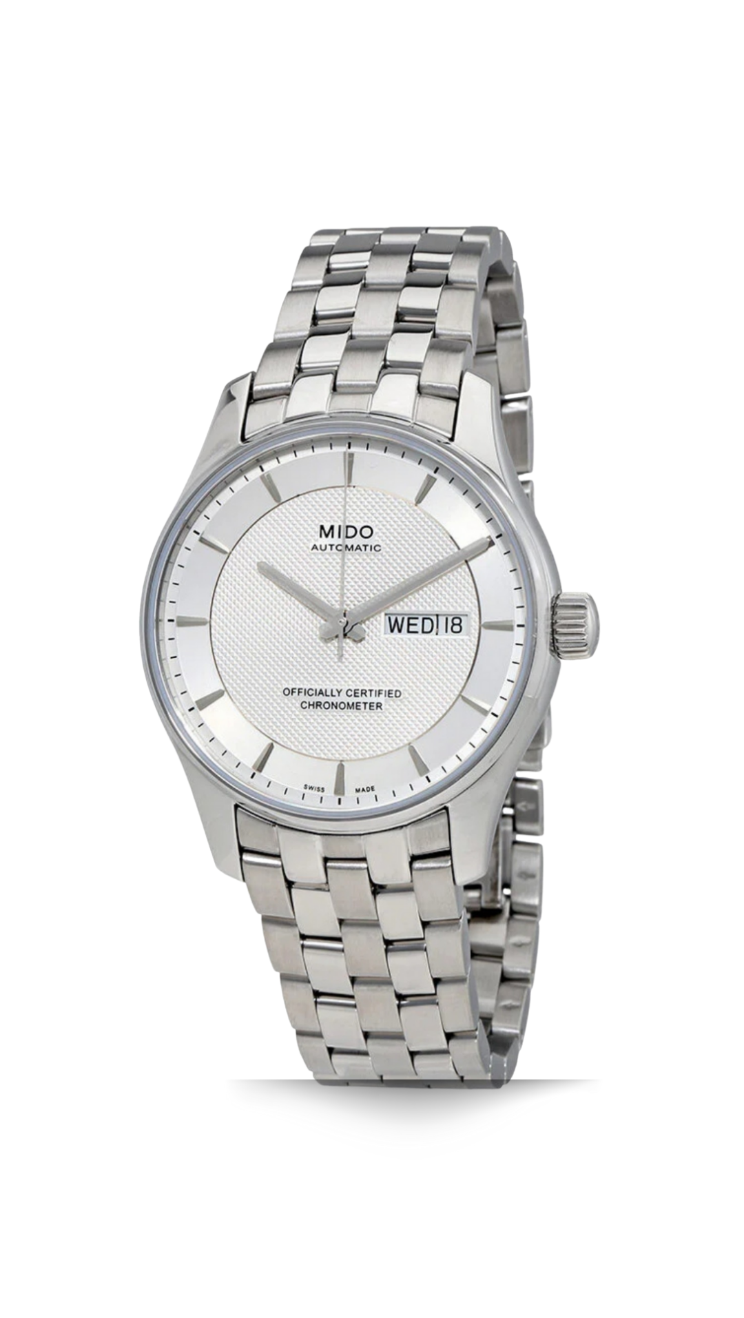 The Mido Belluna Clou de Paris men’s watch embodies Swiss craftsmanship and elegance. This automatic timepiece, powered by the reliable ETA 2678 movement, offers a robust 40-hour power reserve. Its sleek 40mm stainless steel case houses a striking silver dial, protected by a scratch-resistant sapphire crystal. Functionality is enhanced with a convenient date display at 3 o’clock and a user-friendly pull and push crown for easy adjustments. The exhibition case back allows wearers to admire the watch’s intricate mechanics, while its water resistance up to 100 meters ensures durability for active lifestyles. Complementing its sophisticated design is a matching silver stainless steel bracelet secured with a deployment clasp. This watch is not just a timekeeper; it’s a statement accessory for the modern man.