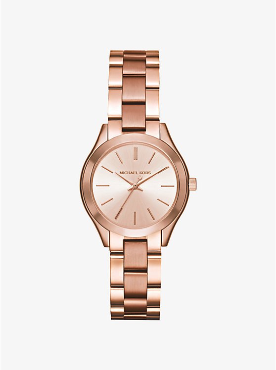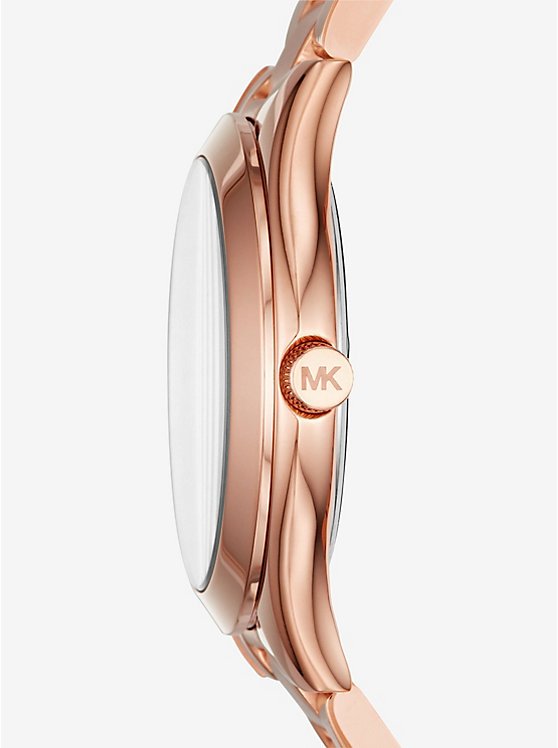 The Michael Kors Slim Runway MK3513 is a refined and modern women’s timepiece that blends subtle elegance with everyday versatility. Designed in polished rose gold-tone stainless steel, this watch delivers a sleek and feminine silhouette, complemented by a minimalist rose-gold sunray dial that enhances its sophisticated appeal. The slim 34 mm case and lightweight profile make it perfect for daily wear, while the quartz movement offers reliable and accurate timekeeping. Protected by a hardened mineral crystal and water-resistant to 50 meters, the MK3513 maintains durability without compromising style. Paired with a matching rose gold-tone stainless-steel bracelet, this Slim Runway model is a beautiful accessory for both casual and dressed-up looks, capturing the chic and timeless aesthetic that defines Michael Kors.