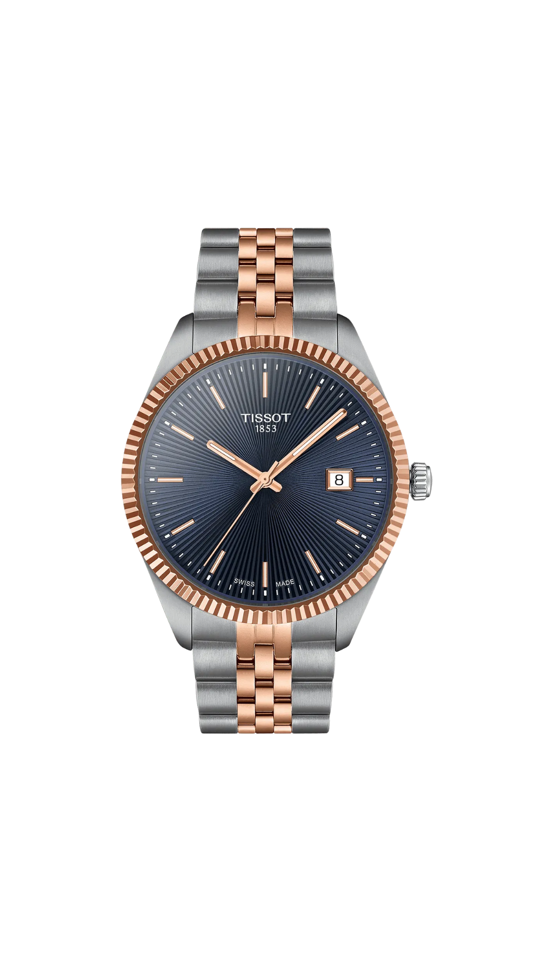 The Tissot Ballade 40mm (T156.410.22.041.00) is a refined expression of classic Swiss elegance, designed to elevate your style during life’s most special moments. Its beautifully executed blue guilloché dial features delicate sunbeam rays that reflect light with depth and sophistication, while the fluted bezel adds a distinguished decorative touch inspired by traditional watchmaking craftsmanship. The round 316L stainless steel case with rose gold PVD coating delivers a warm, luxurious contrast, complemented by a two-tone integrated bracelet that balances elegance and versatility. Powered by a precise Swiss quartz movement with end-of-life indicator, the Ballade ensures reliable everyday performance. Finished with a scratch-resistant sapphire crystal and quick-release bracelet system, this timepiece is a timeless companion for both formal occasions and refined daily wear.
