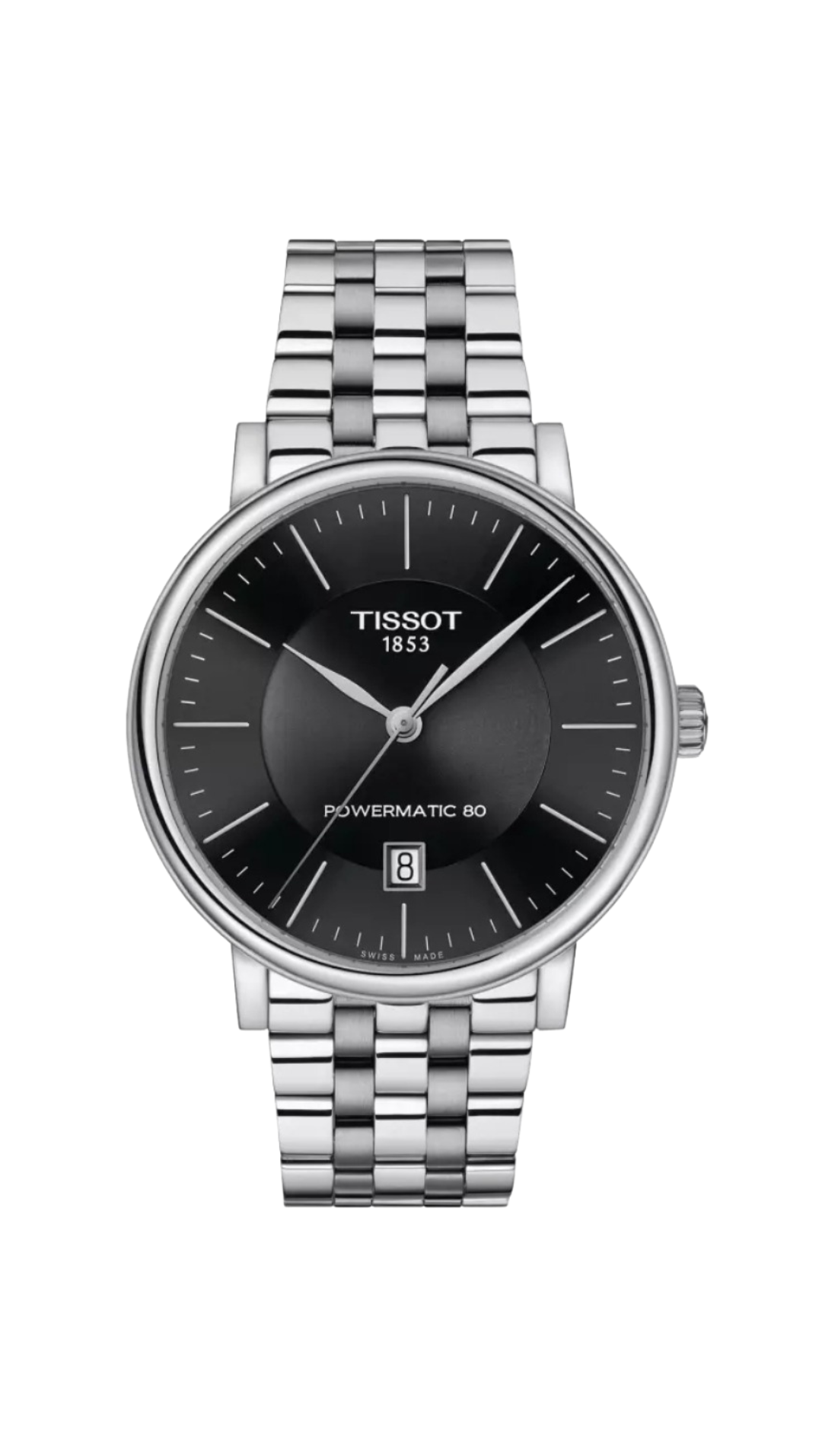 The Tissot Carson Premium Powermatic 80 is a refined everyday timepiece that effortlessly combines classic elegance with cutting-edge Swiss engineering. Its sleek 40mm stainless steel case surrounds a rich black sunray dial, accented with silver-tone Roman numerals and leaf-shaped hands for a timeless and sophisticated look.