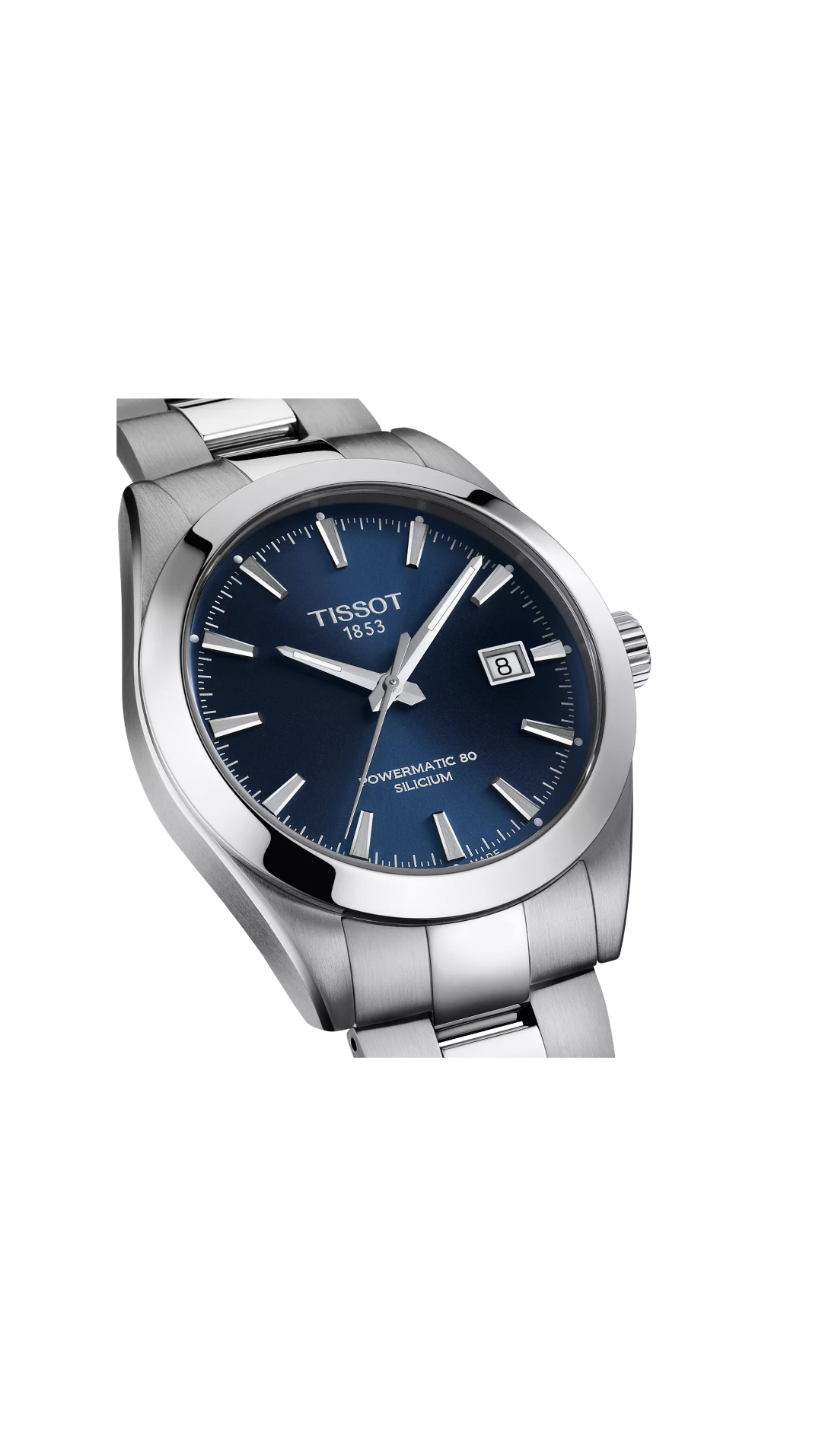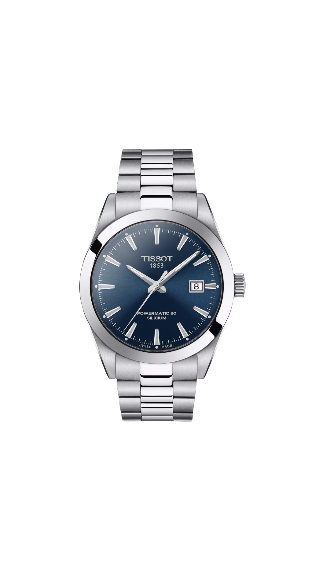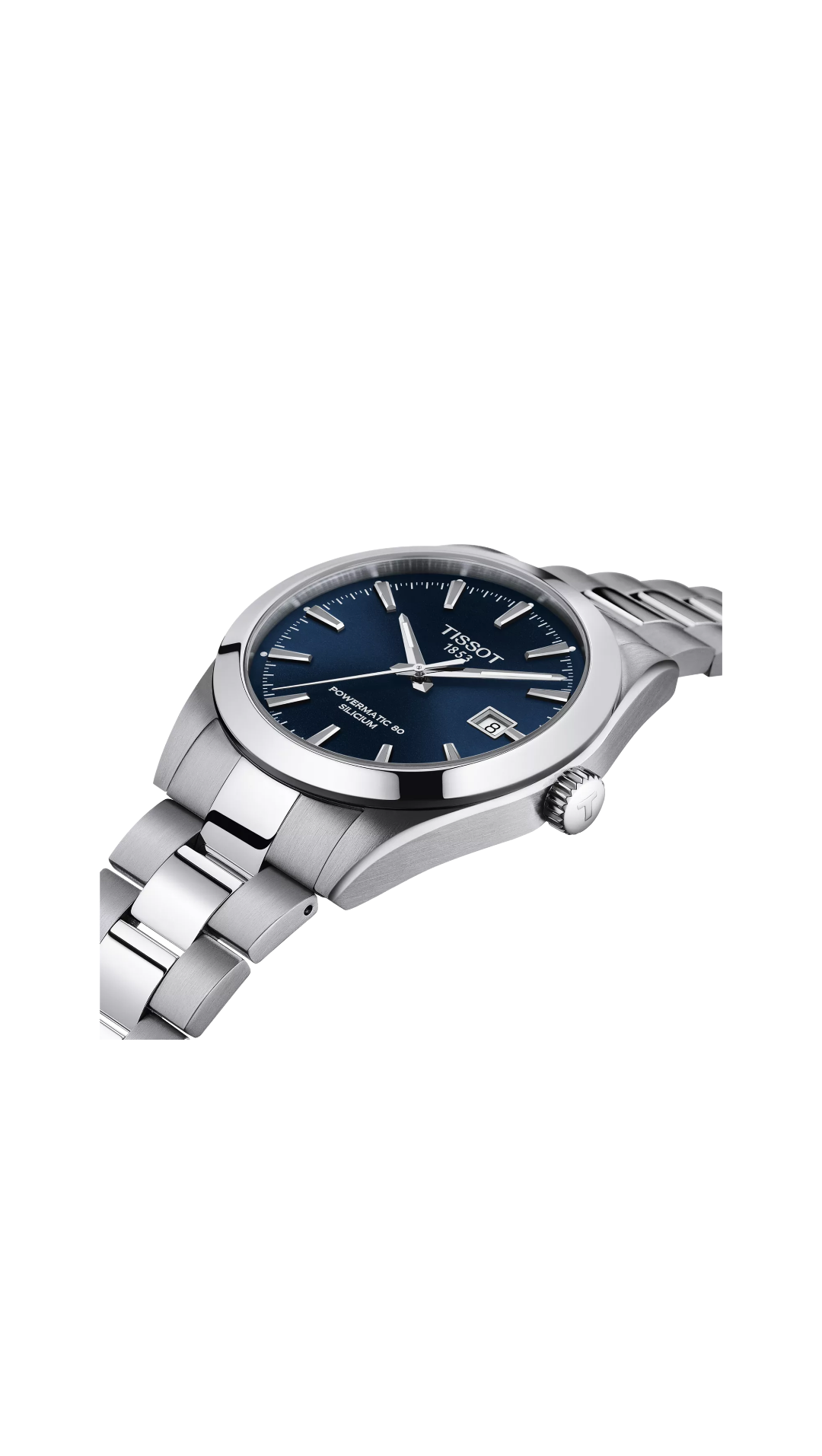 Housed in a 40mm 316L stainless steel case, the watch features a rich blue dial with applied index hour markers and Super-LumiNova®-coated hands for enhanced readability in low-light conditions. A domed sapphire crystal with antireflective coating protects the dial, while the exhibition case back reveals the beautifully finished Powermatic 80 Swiss automatic movement, complete with a silicon balance spring and an engraved rotor featuring Tissot’s signature “Waves of Time” decoration. Delivering up to 80 hours of power reserve, this movement offers exceptional reliability and precision.