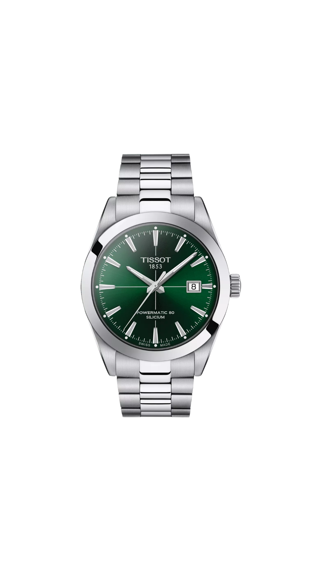 The watch features a 40mm 316L stainless steel case paired with a striking green dial accented by applied index hour markers and Super-LumiNova®-coated hands for excellent legibility in low-light conditions. A domed sapphire crystal with antireflective coating protects the dial, while the exhibition case back offers a clear view of the Powermatic 80 automatic movement, showcasing the finely engraved rotor with Tissot’s signature Waves of Time decoration.