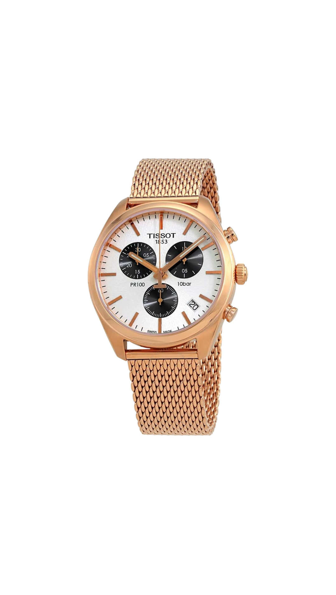 The Tissot PR 100 Chronograph is a modern classic that seamlessly combines Swiss precision with elegant design. Part of the T-Classic collection, this 41mm round watch features a stainless steel case with rose gold PVD accents and a matching steel and rose gold PVD bracelet, offering a sophisticated and versatile look suitable for both formal and everyday occasions. The chronograph functionality, small seconds sub-dial, and date display provide practical features while maintaining a clean, balanced dial layout. Powered by a reliable Swiss quartz movement and protected by a scratch-resistant sapphire crystal, the PR 100 Chronograph ensures precision, durability, and timeless style. With water resistance up to 100 meters and a two-year manufacturer’s warranty, it is a dependable and refined choice for the modern gentleman.