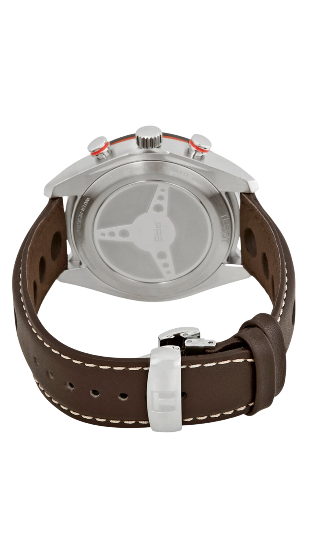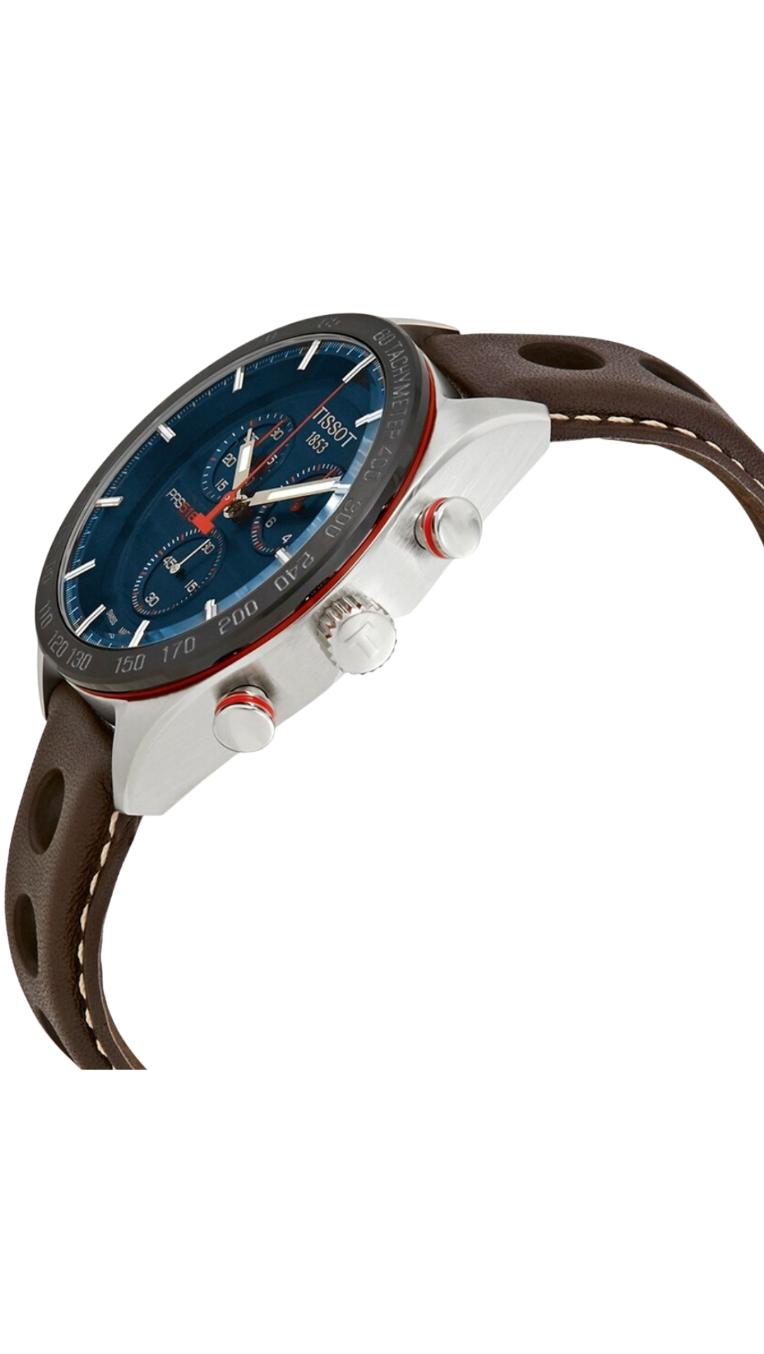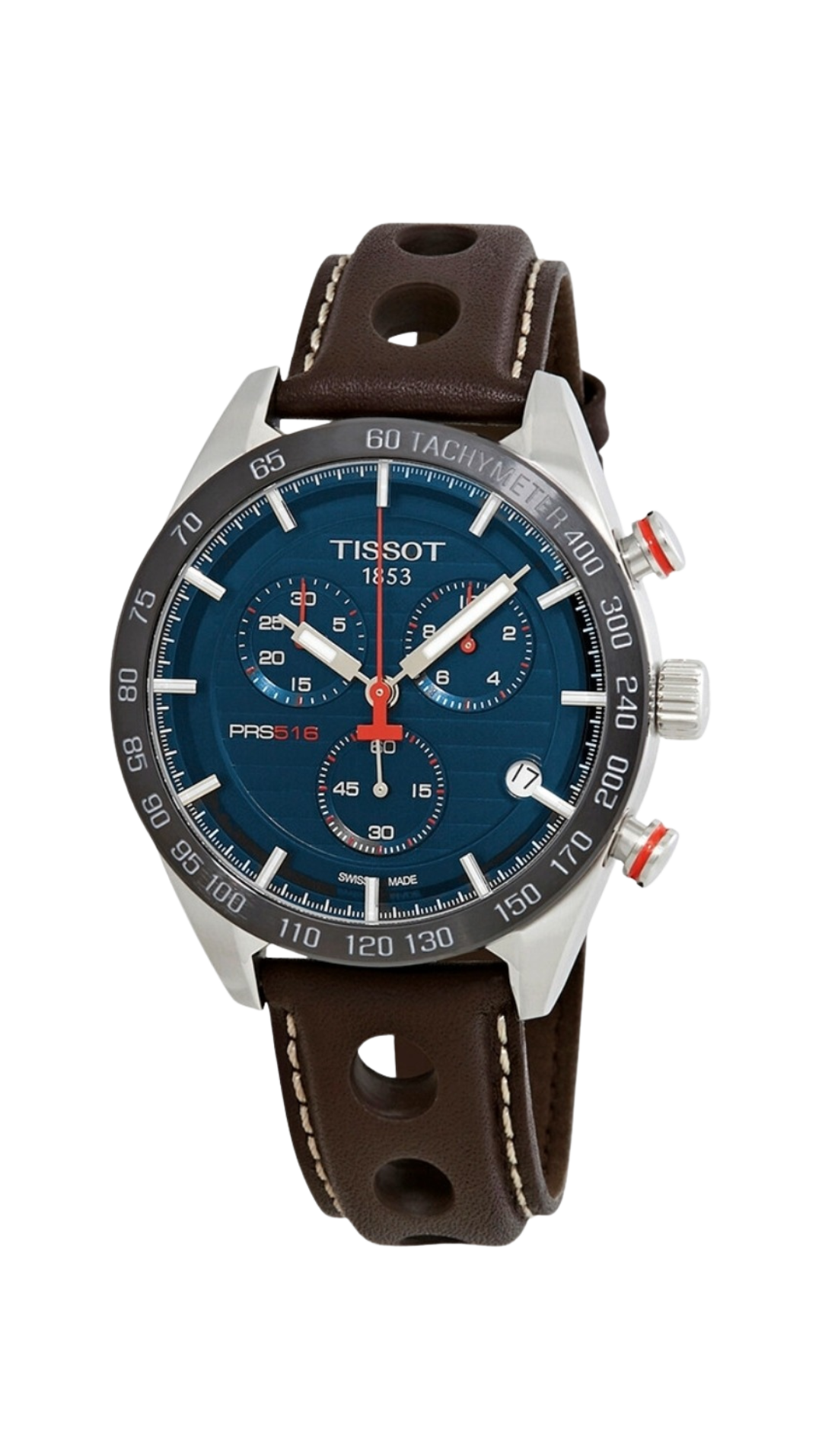 Inspired by Tissot’s rich motorsport heritage, this timepiece features a bold blue dial complemented by a sleek dark brown leather strap.