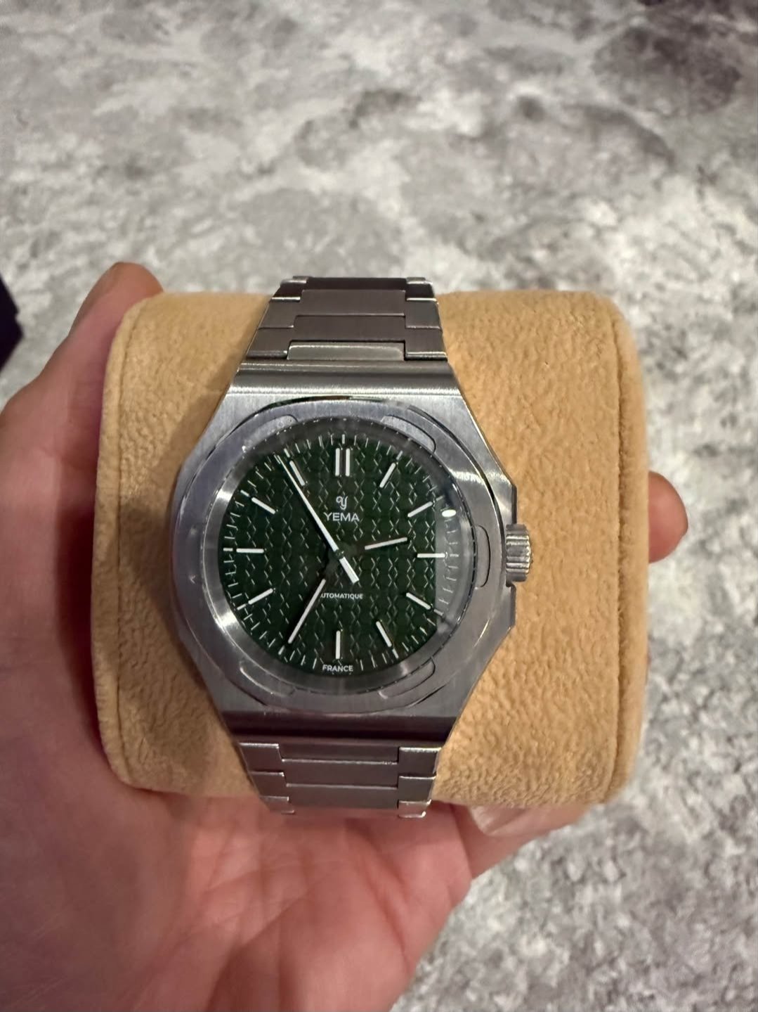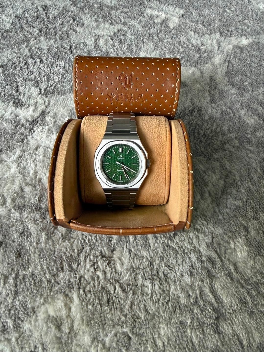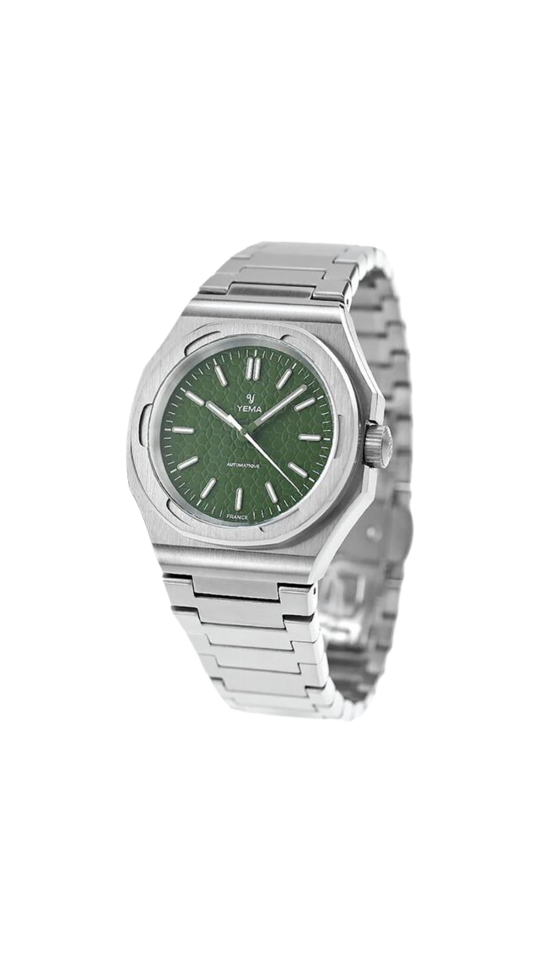 The Yema Urban Traveller is a modern interpretation of a sporty everyday timepiece, blending refined finishing with a bold, contemporary design. Its textured green dial adds depth and character, perfectly complemented by polished stainless steel accents and an integrated bracelet for a seamless, streamlined look. Designed for versatility, this watch transitions effortlessly from casual wear to more elevated settings. Built with durable materials, sapphire crystal, and reliable construction, the Urban Traveller delivers both style and everyday practicality in a well-balanced 39mm case.