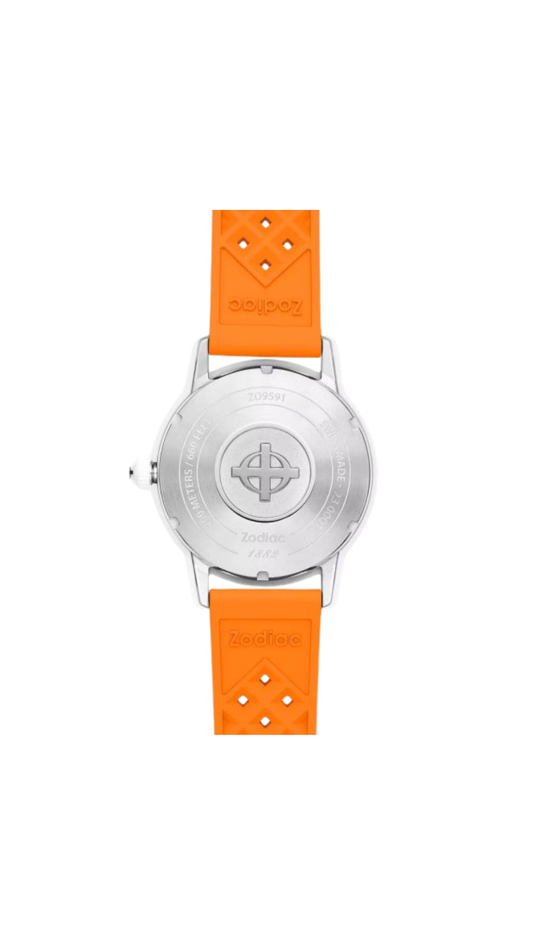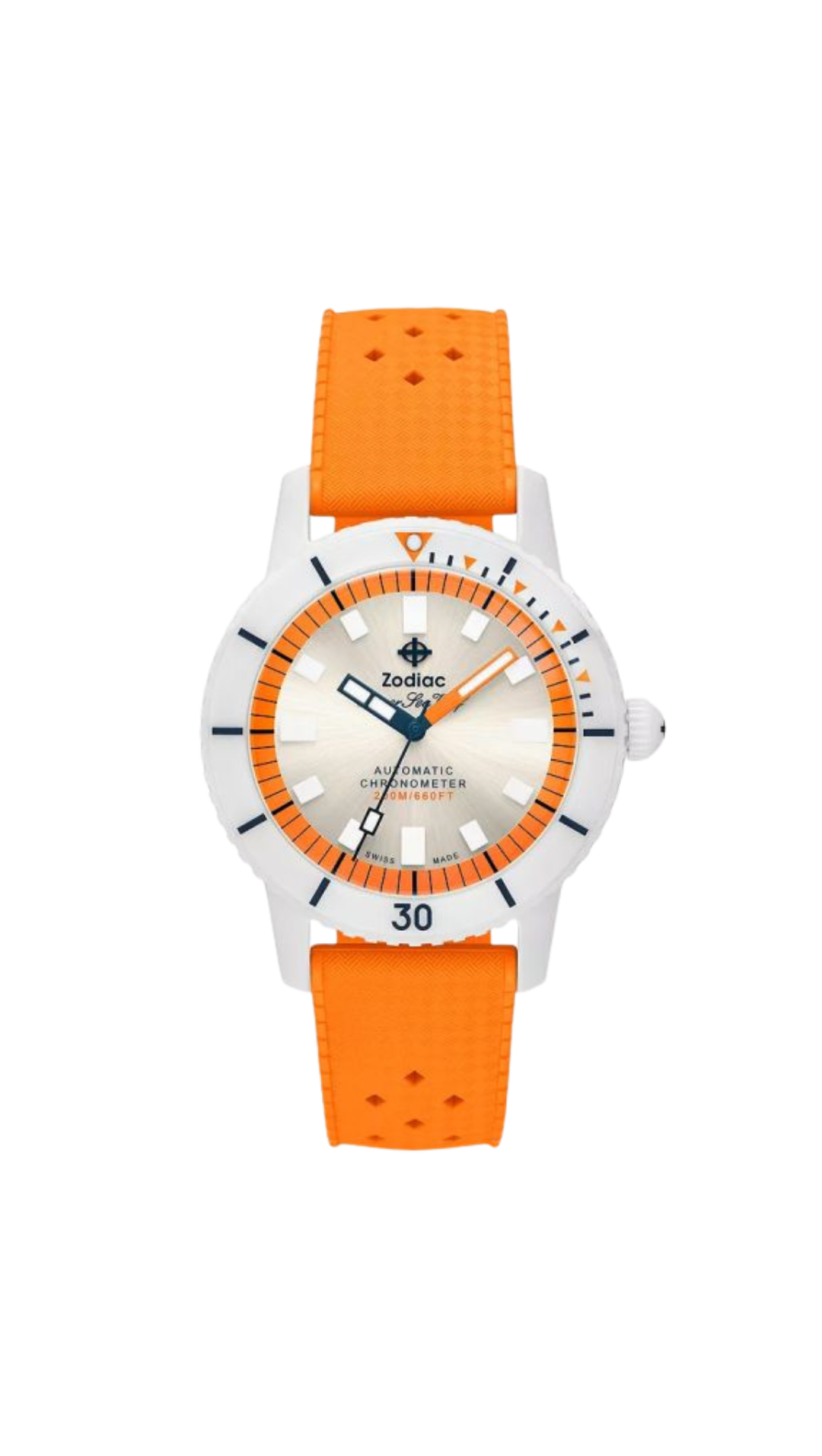 The Zodiac Super Sea Wolf Ceramic Compression Diver ZO9591 is a striking fusion of modern engineering and bold summer-ready design. Featuring a 41mm ceramic and stainless-steel case, this COSC-certified diver delivers both toughness and refined style. Its crisp white matte dial contrasts beautifully with Super-LumiNova hands and markers, ensuring exceptional visibility in any environment. Powered by the Swiss-made STP 1-11 automatic movement with a robust 44-hour power reserve, it offers precision and reliability for any adventure. Paired with a vibrant orange rubber strap, this Super Sea Wolf embodies the spirit of exploration with standout aesthetics, professional-grade 200-meter water resistance, and Zodiac’s iconic diving heritage.